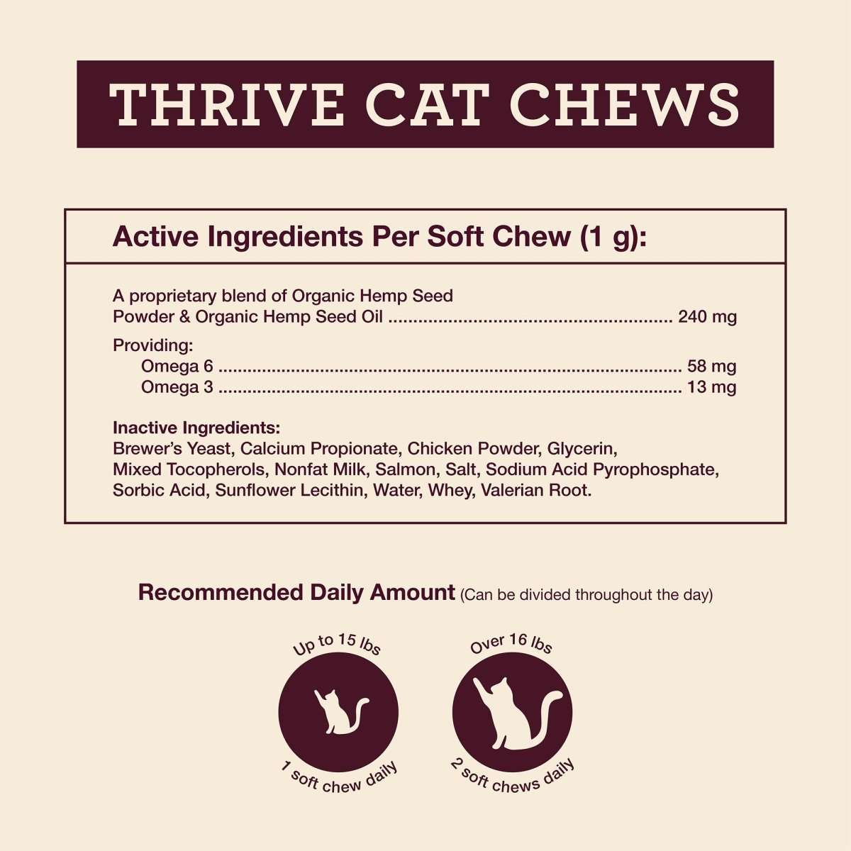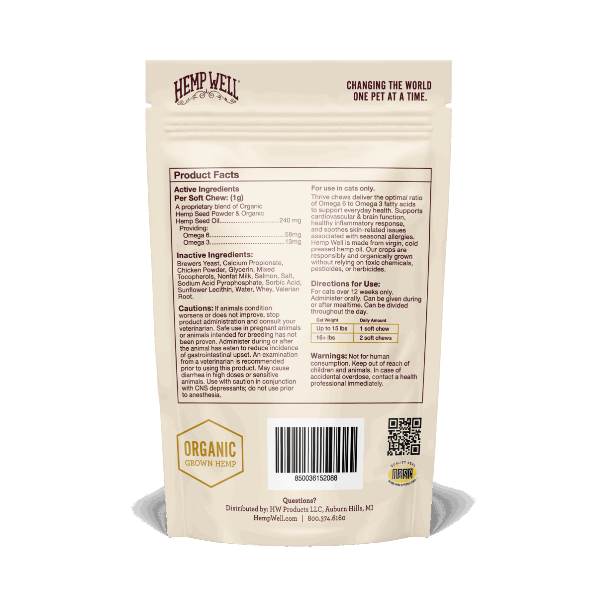 Give your cat top-quality care with natural, premium ingredients designed to enhance overall health, vitality, and happiness. Hemp Well Thrive Cat Soft Chews deliver crucial omegas from organic hemp to support healthy skin, a shiny coat, cardiovascular health, and immune strength. Crafted without fillers and offering a perfectly balanced Omega 3 to 6 ratio, these soft chews promote brain, heart, and immune wellness for cats of every age and breed.