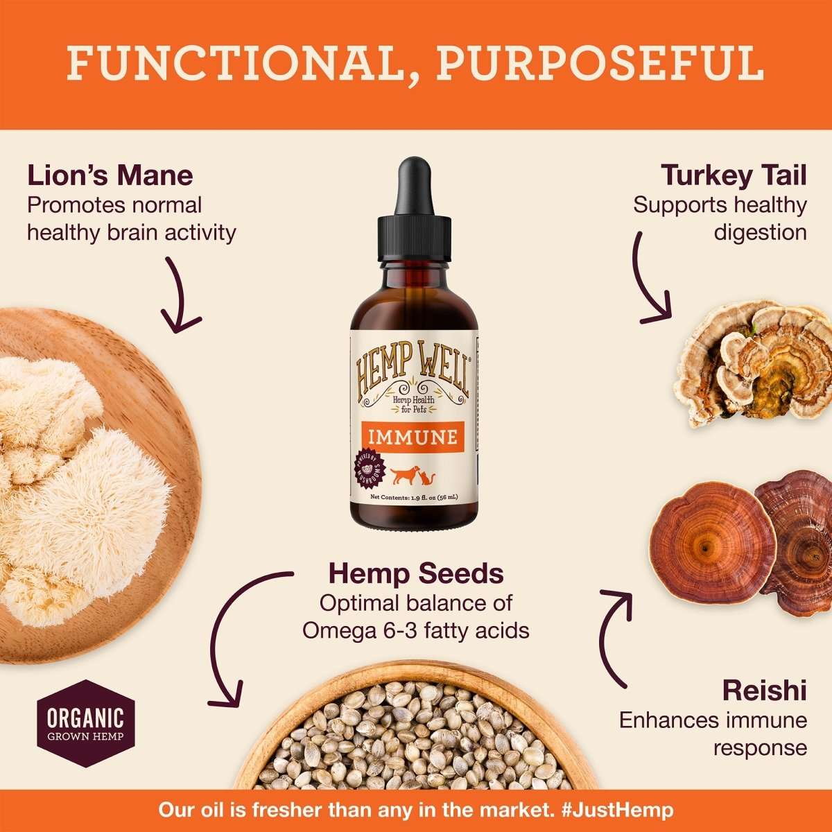 Not all mushroom supplements are created equal. Many mycelium-based products are grown on grain, which can dilute the active compounds. Hemp Well’s immune products are made with pure fruiting body extracts, so your pet gets maximum immune-supporting benefits in every chew or drop.